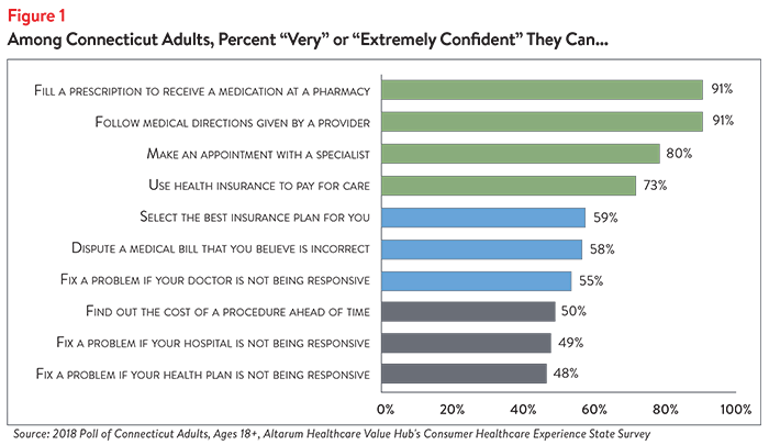 Out of 10 healthcare tasks, Connecticut residents have the least confidence in their abilities to correct billing and work with their doctor, hospital or health plan to resolve problems. Connecticut residents report being confident that they can fill a prescription or follow the directions provided by their doctor. They are less confident when dealing with cost issues, such as disputing a medical bill error or finding the cost of a procedure ahead of time. Fewer than half of Connecticut adults are confident they can take steps to fix a problem if their doctor, hospital or health plan is not responsive to their concerns (Figure 1).